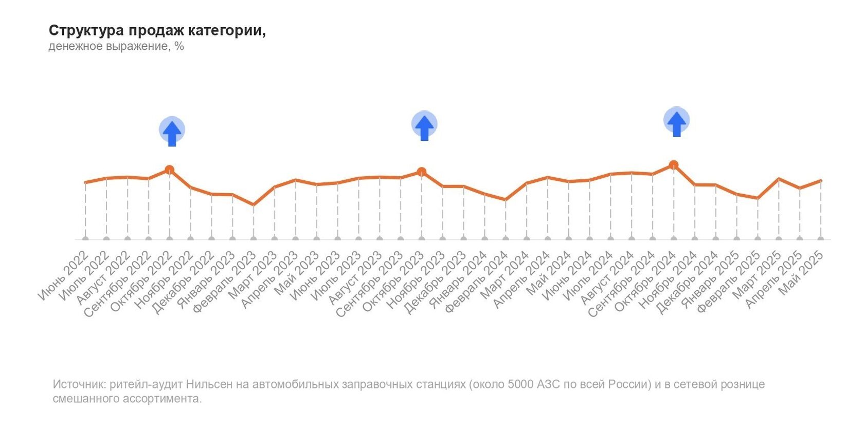 Для категории моторных масел характерна ярко выраженная сезонность продаж и достаточно заметные всплески спроса в определенные периоды года, которые особенно важны с точки зрения продвижения брендов и коммуникации с покупателем.