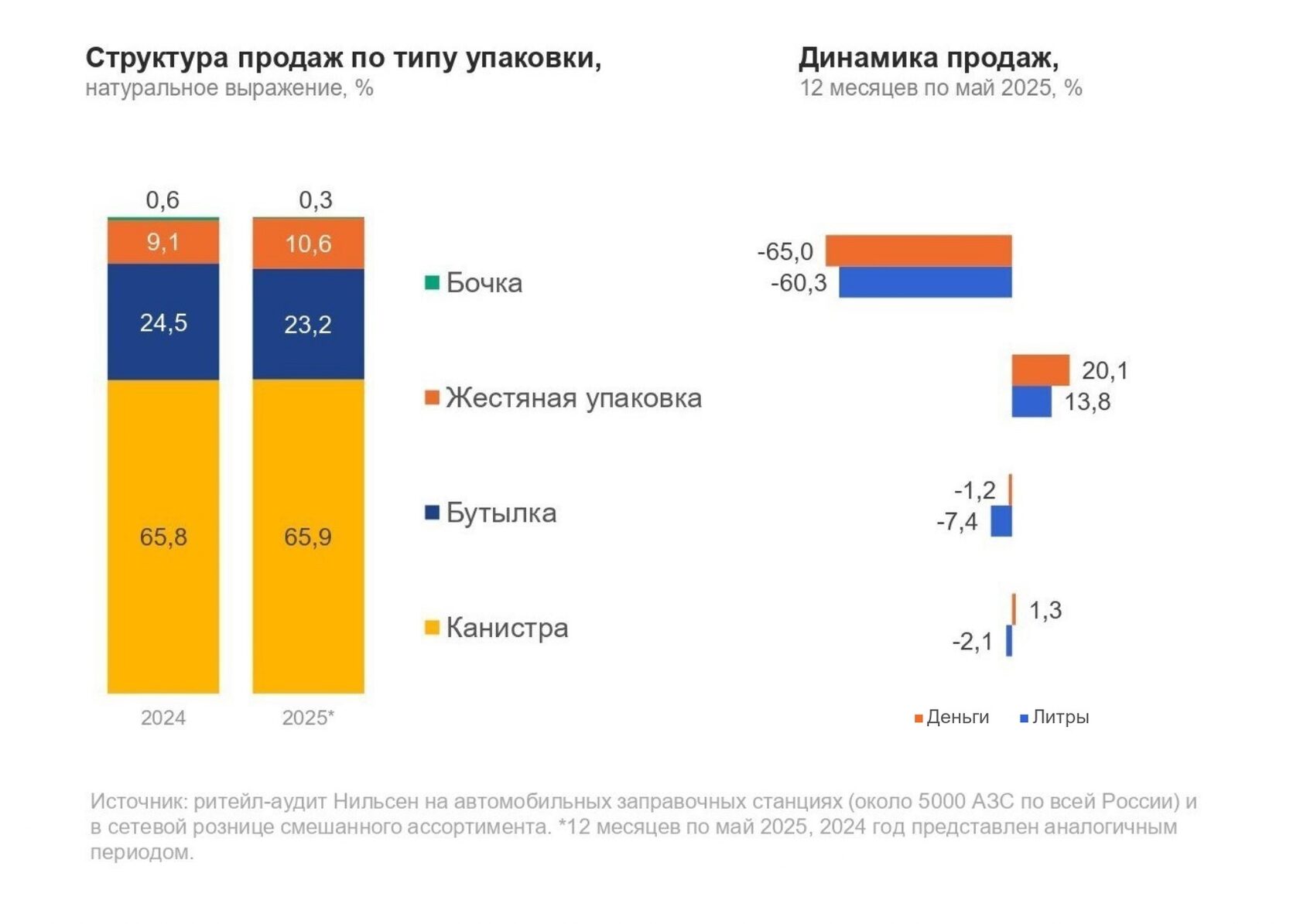 Если говорить об упаковке, то безусловным лидером по-прежнему остается канистра: на нее приходится почти 70% продаж. Однако самым быстрорастущим сегментом в категории сейчас является формат жестяной упаковки.
