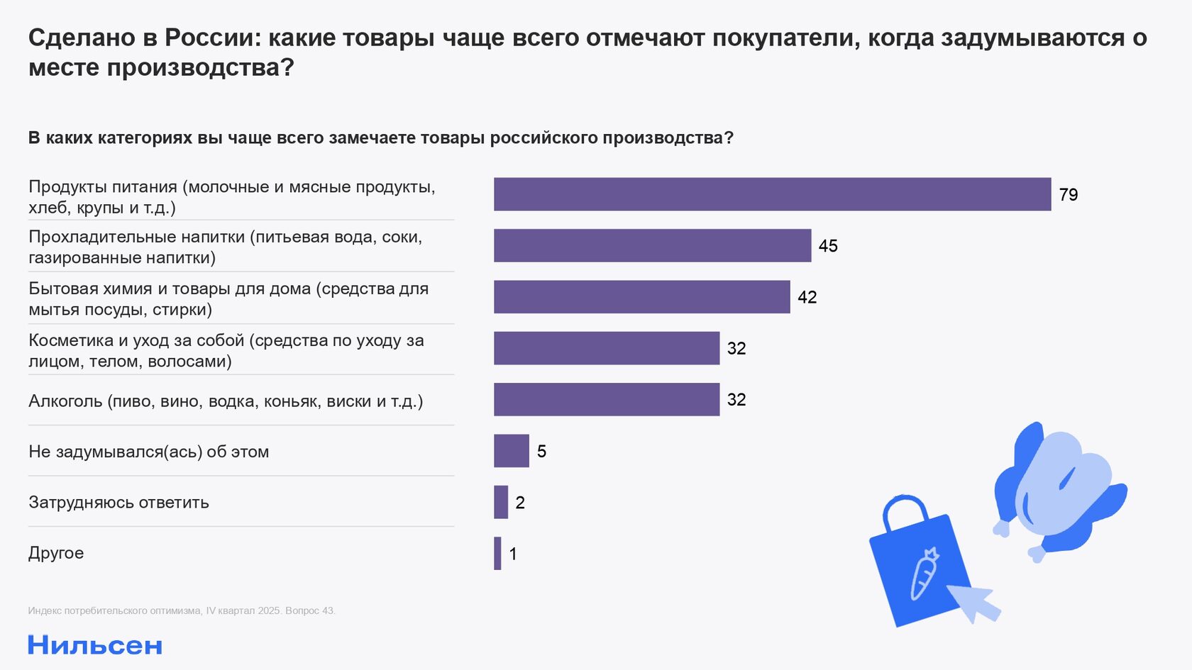 «Говоря о том, в каких категориях покупатели чаще всего замечают товары российского производства, на первое место ожидаемо выходят продукты питания — молочная, мясная продукция, хлеб и не только (79%). Это те ультра-свежие категории, где традиционно сильны региональные игроки — и в зависимости от географии продаж полка таких продуктов может сильно варьироваться.