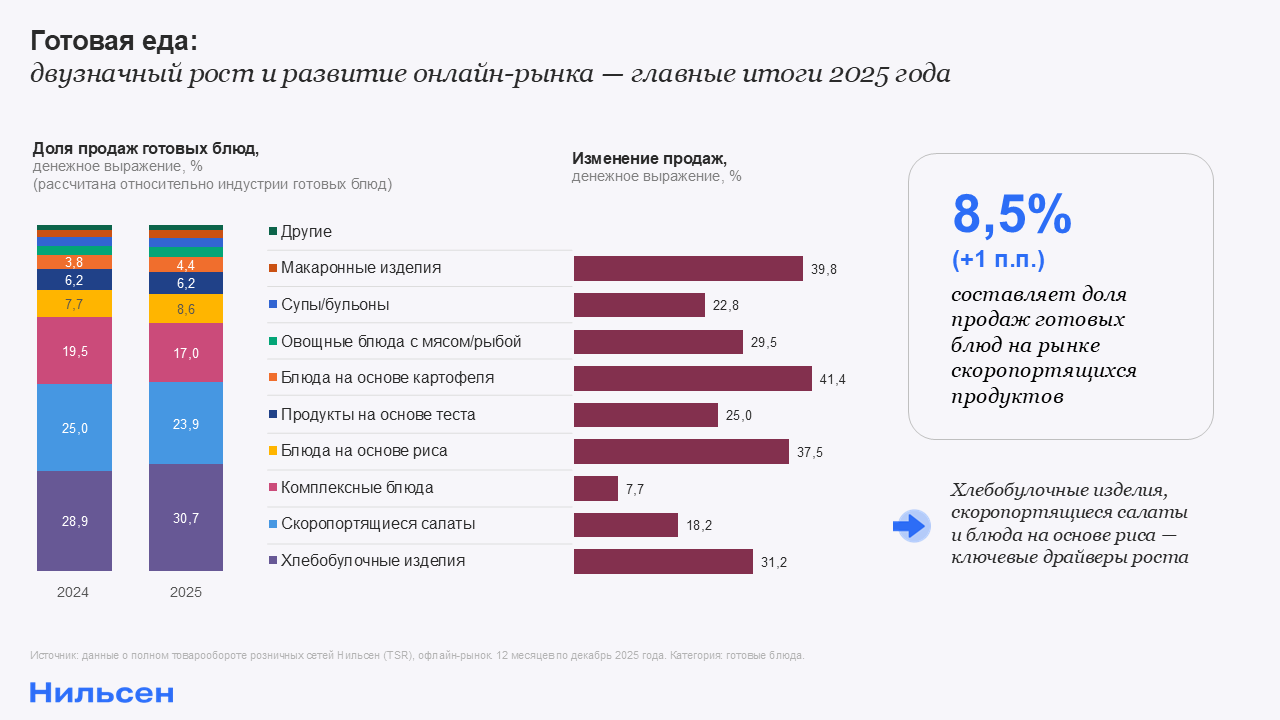 Такой спрос напрямую связан с более широкими изменениями покупательского поведения. Покупатели всё чаще комбинируют сценарии экономии и трат, но при этом не готовы отказываться от разнообразия, новых впечатлений и «маленьких удовольствий». Готовая еда оказывается на пересечении сразу нескольких этих трендов: она экономит время, предлагает широкий выбор, позволяет экспериментировать со вкусами и при этом воспринимается как удобный и понятный выбор.