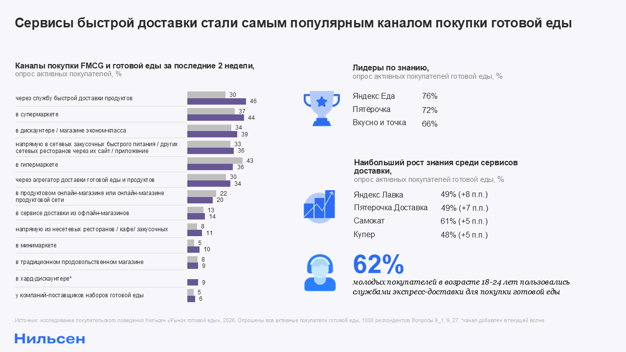 В 2025 году на рынке готовой еды сменился лидер среди каналов ее продаж. Если раньше ее покупка ассоциировалась с доставкой из кафе и ресторанов, то сегодня эту нишу все активнее занимают сервисы быстрой доставки продуктов: именно они вышли на первое место среди тех покупателей, кто активно покупает такие продукты. Их в качестве канала покупки выбрали 46%, что на 16 п.п. больше, чем в прошлом году. Сильнее всего в сегменте доставки позиции укрепили «Яндекс.Лавка» (49%, + 8 п.п.), «Пятёрочка.Доставка» (49%, + 7 п.п.), «Самокат» (61%, + 5 п.п.), а также «Купер» (48%, +5 п.п.).