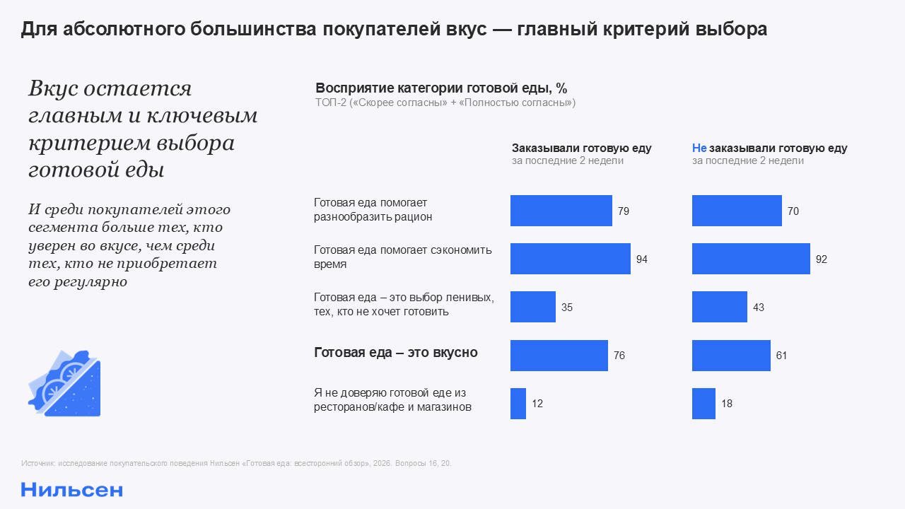 Фундамент роста готовой еды — удобство и экономия времени. Именно этот фактор остаётся ключевым драйвером категории: 90% покупателей воспринимают готовую еду как способ сэкономить время, а среди тех, кто покупал её в последние две недели, этот показатель достигает 94%.