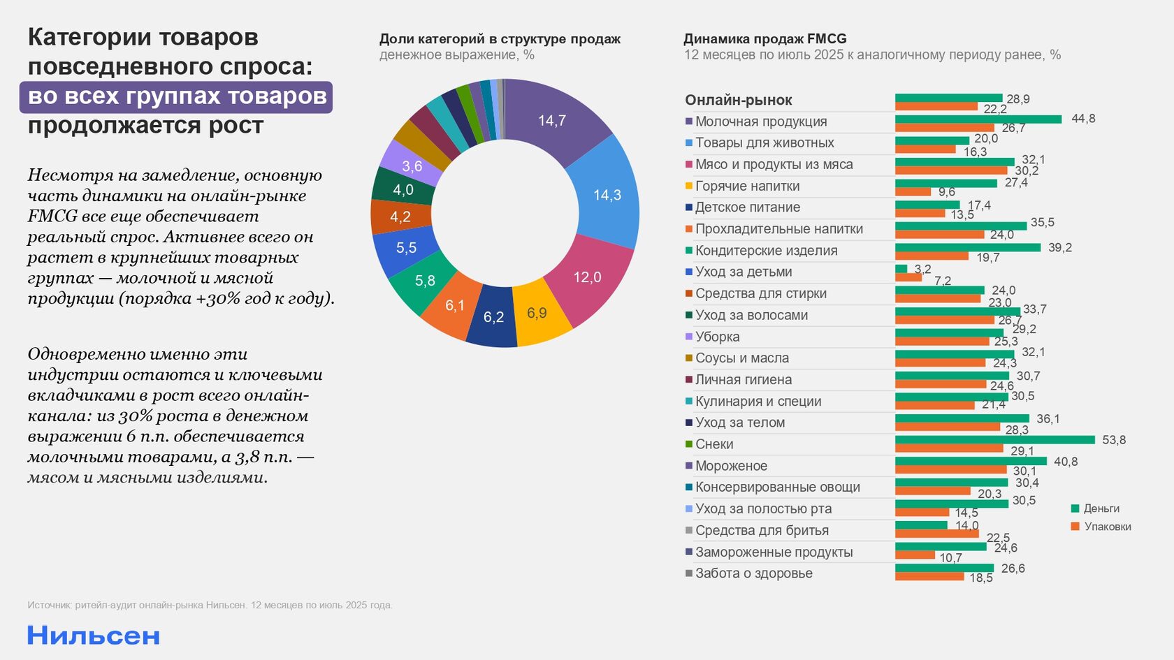 Аналитические выводы в этой статье основаны на данных аудита омниканального рынка FMCG, который включает более 150 розничных сетей и 50 интернет-магазинов и маркетплейсов по всей России, а также синдикативных исследованиях Нильсен «Продажи частных марок на онлайн-рынке» и «Исследование трендов покупательского поведения». Если вы хотите узнать больше об этих продуктах, напишите нам на почту info@n-df.ru.