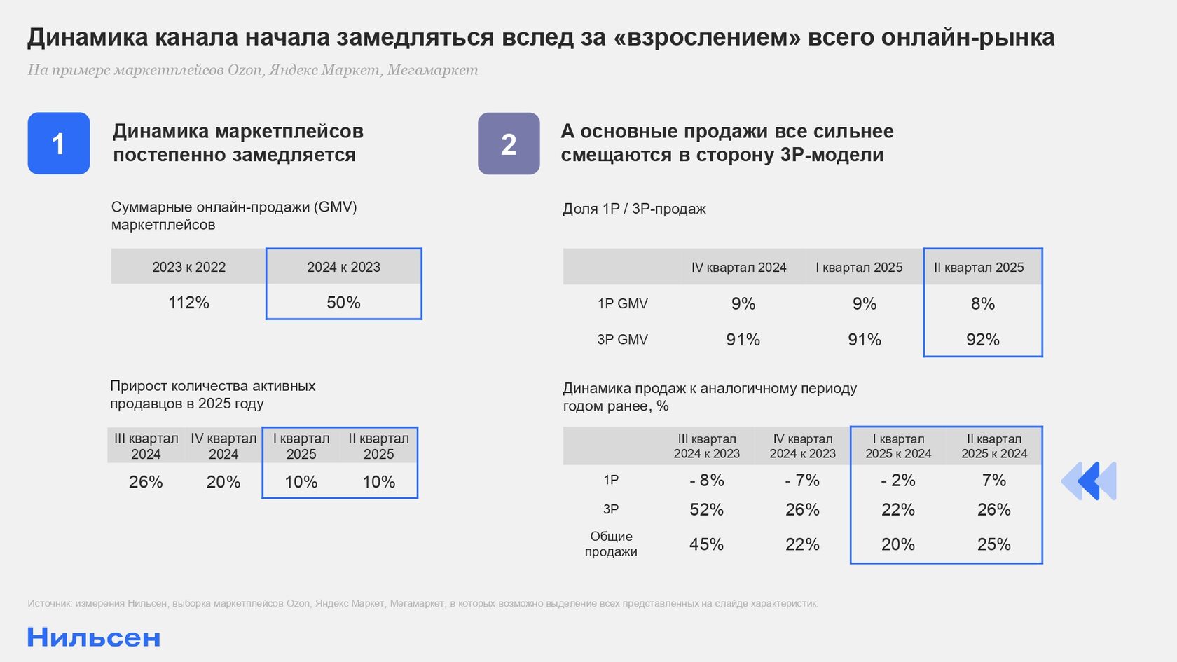 Говоря о маркетплейсах, нельзя не остановиться на том факте, что и они в настоящий момент тоже проходят собственную трансформацию: динамика их продаж замедляется наряду со всем онлайн-рынком FMCG, количество продавцов растет уже не так активно (10% ежеквартально), а динамика модели 1Р — то есть собственных продаж маркетплейса — уже оказывалась в минусе в предыдущих периодах анализа.