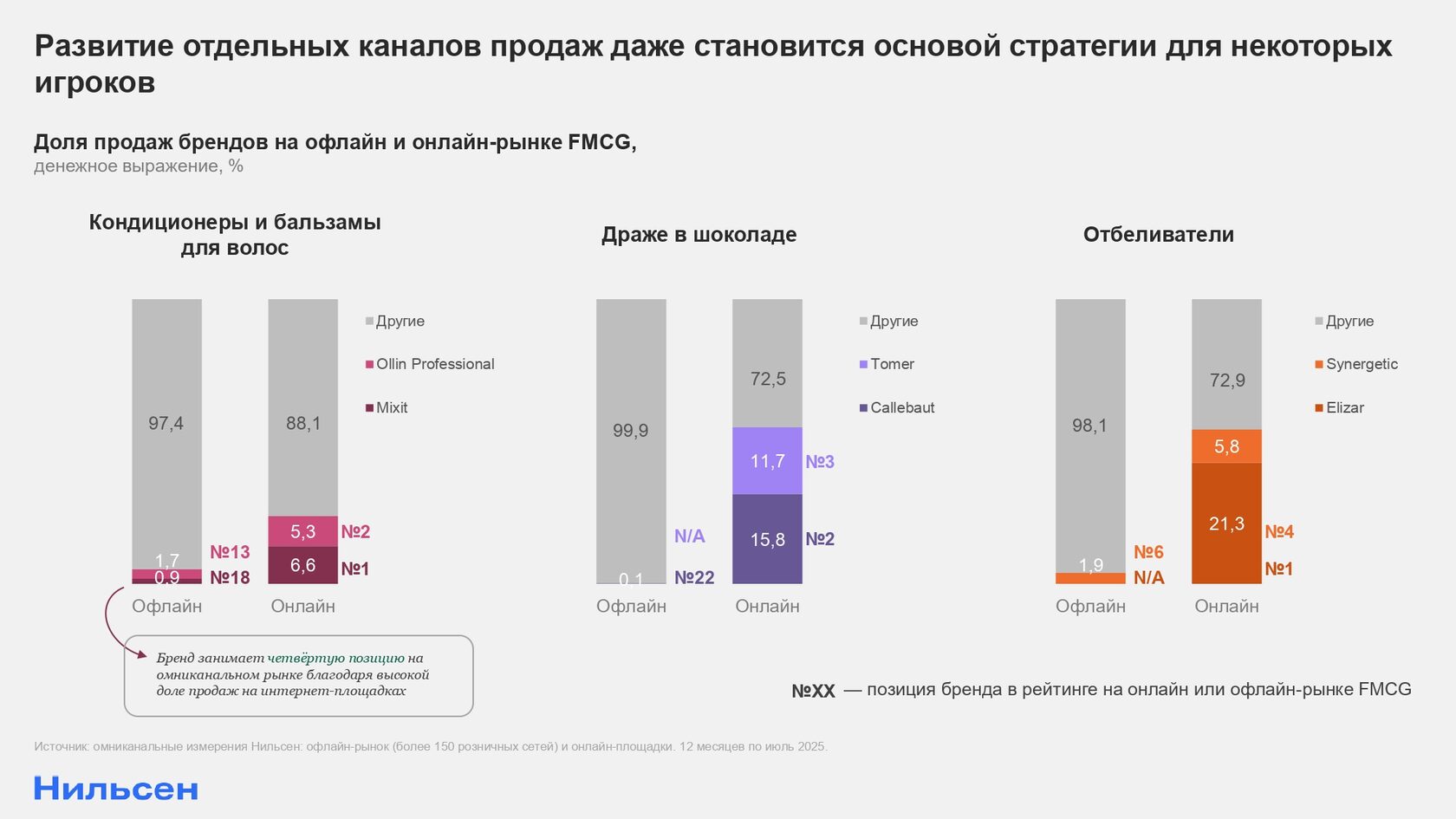 Таких иллюстраций становится все больше. Например, Elizar — марка, которая не представлена в офлайн-сетях, но активно продается онлайн — и занимает сразу первую строчку в рейтинге категории отбеливателей с долей рынка в 21,3%. Или бренды Tomer и Callebaut в категории драже в шоколаде. В то время как первый из них не продается в офлайн-точках, а второй занимает 22 место в офлайн-рейтинге своей категории, в интернет-магазинах ситуация иная — и эти бренды располагаются уже на 3 и 2 позициях.