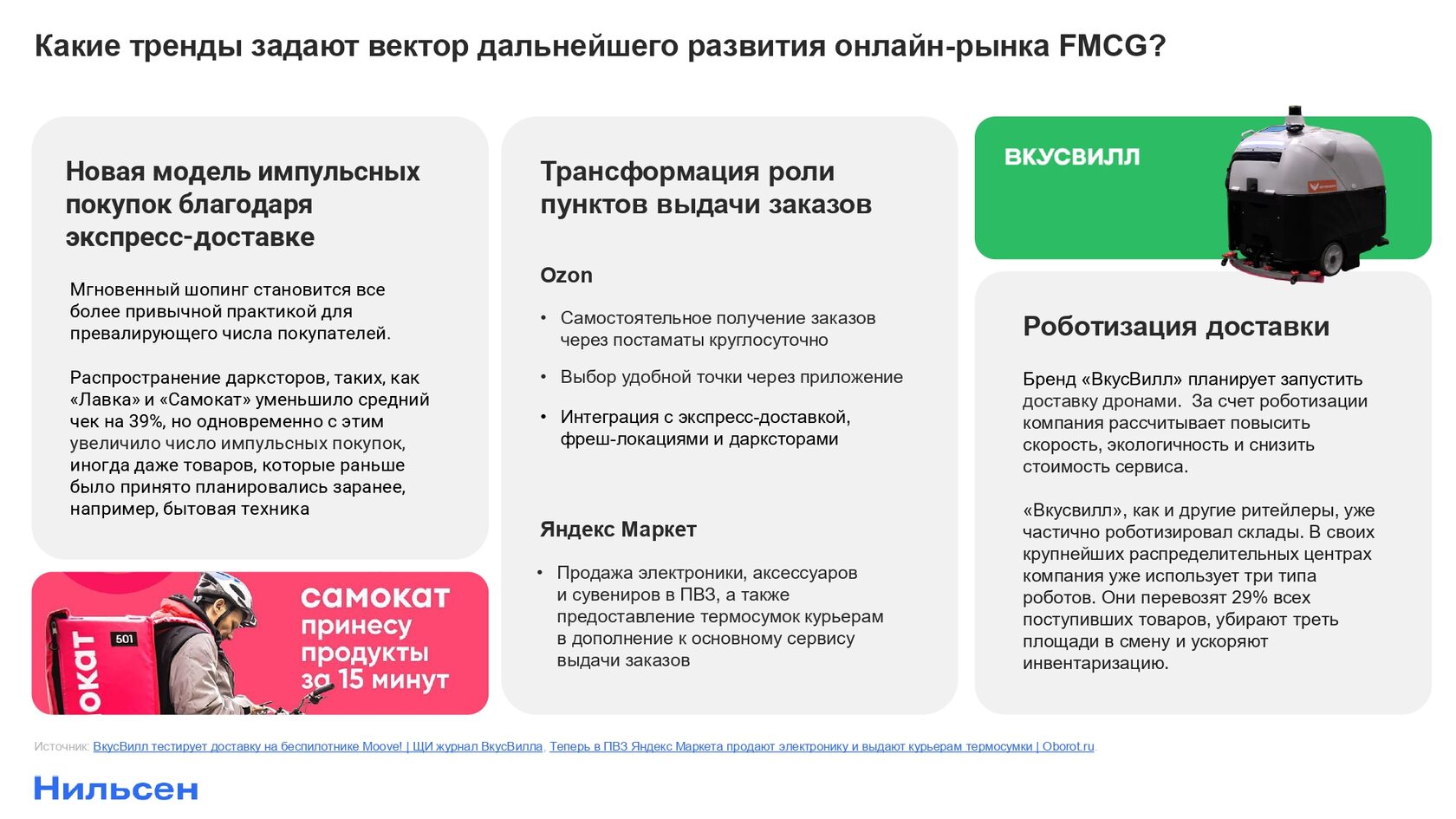 На фоне всех этих трендов и усиления конкуренции онлайн-рынок постепенно переходит к новой модели: игроки совершенствуют инструментарий и аналитику, инвестируют в улучшение пользовательского опыта и вовлечения, активно работают с ассортиментом и скоростью. На фоне того, что мгновенный шопинг становится все более привычной практикой для покупателей, возможность быстрого заказа товаров способствует импульсному спросу даже на те категории, покупка которых раньше планировалась заранее. К примеру, ритейлер «Самокат» предлагает по клику за 15 минут доставить самые разные категории товаров, от посуды до нишевой парфюмерии, а «Яндекс Лавка» — от канцелярии до «умного дома» и не только.