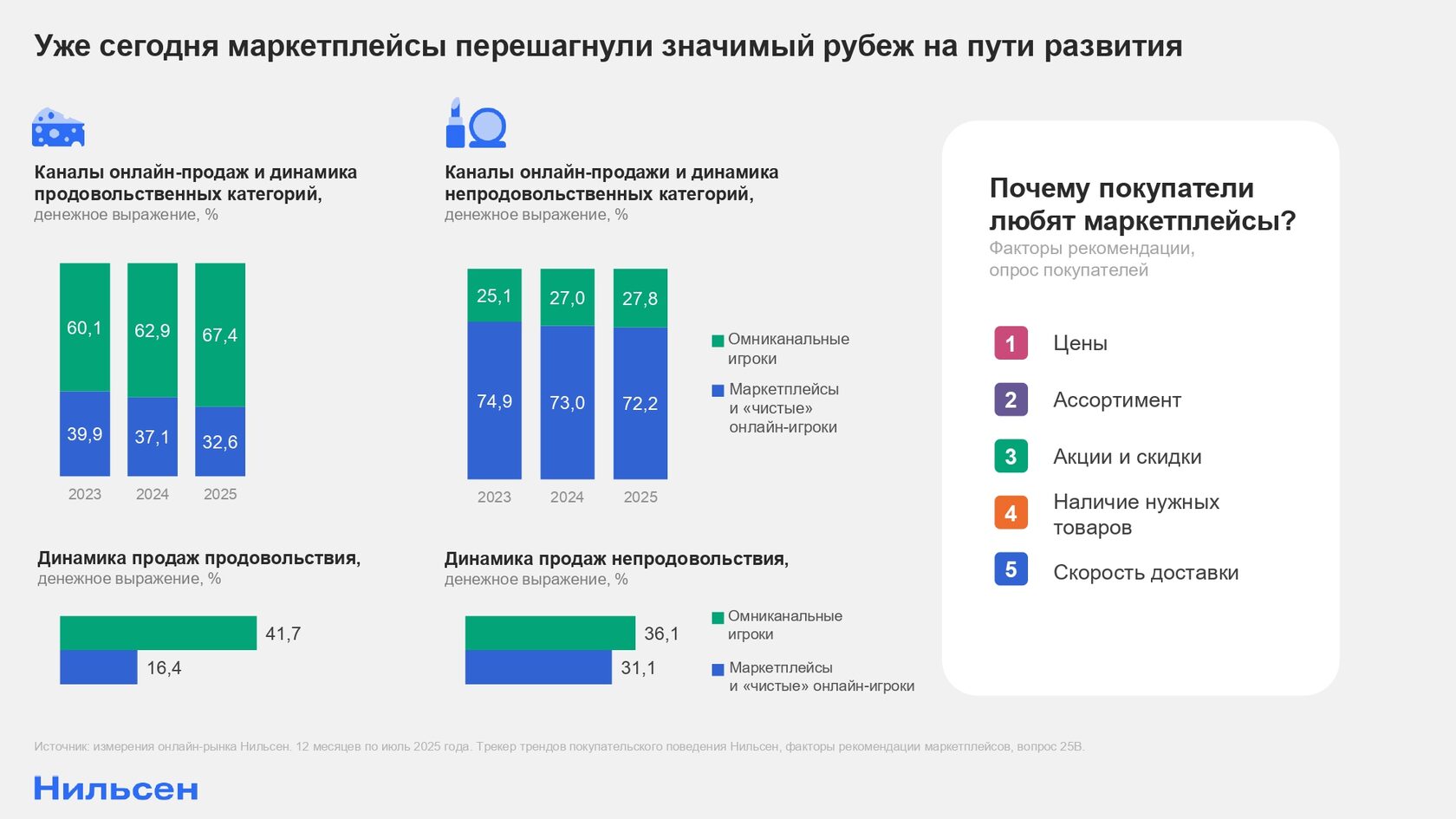 Примеры такого «усиления» позиций за счет онлайн-рынка можно найти в широком перечне категорий — особенно в непродовольственном сегменте, где более 70% интернет-продаж приходится именно на маркетплейсы и «чистых» онлайн-игроков — то есть на те площадки, которые не имеют физических торговых точек.