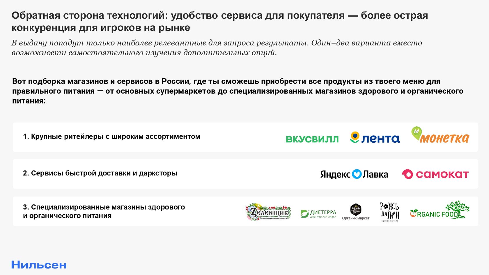 Однако в контексте этого тренда особое внимание заслуживает и еще один вопрос, связанный с экспоненциальным развитием ИИ-технологий и их влиянием на покупательский выбор. Уже сейчас ответы ИИ-ассистентов сужают предлагаемый список продуктов или магазинов для их покупки до 1–3 наименований, что в перспективе нескольких лет будет означать еще более острую конкуренцию: технологий, знания покупателя и его пути, уникальности, подходов к вовлечению и удержанию. И учитывая скорость происходящих изменений, вполне вероятно, что уже в ближайшие 1–3 года онлайн-рынок пройдет и текущий этап своей эволюции, уверенно шагнув в будущее.